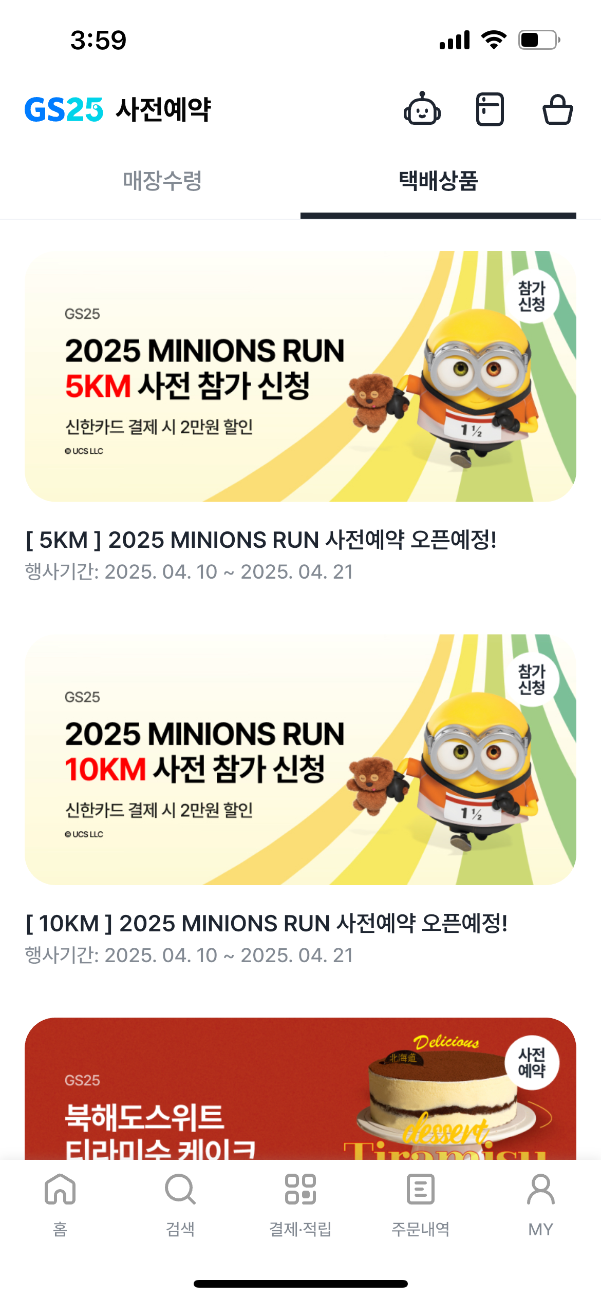 | 신청 절차 요약 | ① 우리동네GS 앱 설치 및 로그인 ② 편의점 사전예약 → 택배상품 ③ <미니언즈런 2025> 배너 클릭 ④ 예약 주문 및 결제 ※ 배송정보 & 결제수단 미리 등록 추천 |